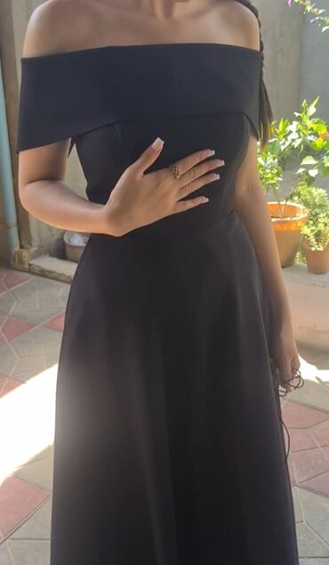 Zərif qara axşam/libas - Model: off-shoulder (çiyinlər açıq), büst hissədə yüngül drapirovka S-M razmerlerine gedir - Siluet: bədənə oturan, aşağıya doğru zərif şəkildə enən uzun ətək - Detallar:...