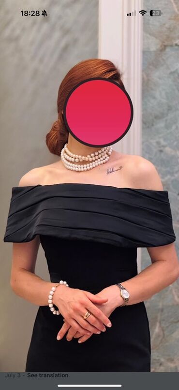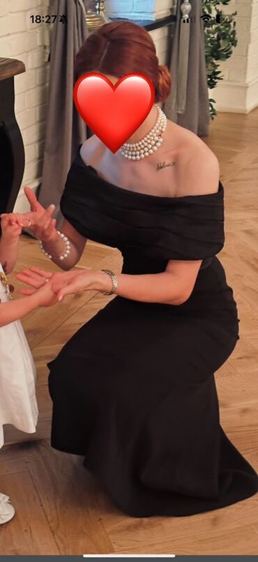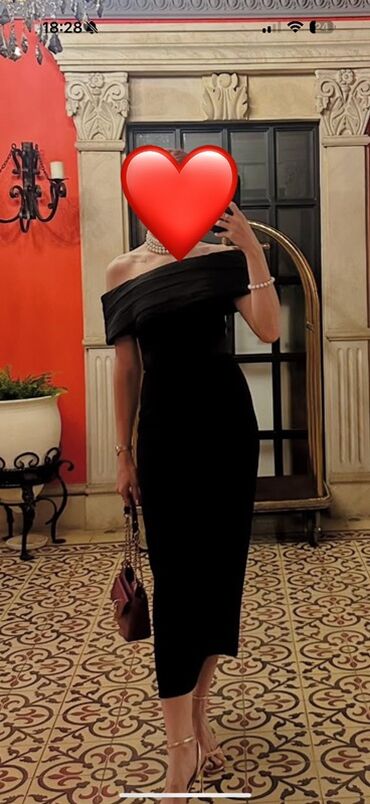 Qara ziyafət/libas - Klasik qara rəngdə, bədənə oturan siluet - Dizaynda düşümlü, enli “off‑shoulder” (açıq çiyin) yaxa xətti - Bel xəttini vurğulayan kəsim, düz ətək - Qalın və formaya saxlayan p...