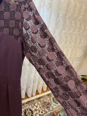 - Dizayn: Dizdən bir az aşağı uzunluqda klassik düz kəsim. Yuxarı hissə və qollar məxməri nöqtə naxışlı, şəffaf krujeva panellərlə işlənib. Sinə xəttindən aşağıdakı hissə hamar parça ilə davam edir, bel hissəsində yığma tikişlər ətəyə yüngül həcim verir.