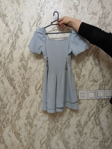 Mavi rəngli “İ SARA” markalı qadın donu - Ölçü: 48 (etiketdə göstərilir) - Model: qolsuz, yüngül A-kəsim, beldən büzməli ətək - Boyun hissəsi: açıq yuvarlaq, metal-qızılı, daşlı bəzək detallı - Ci...