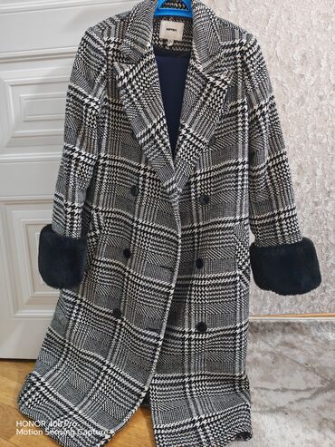 1) Koton – qara-ağ xəz desenli (plaid/ələgöz) uzun palto