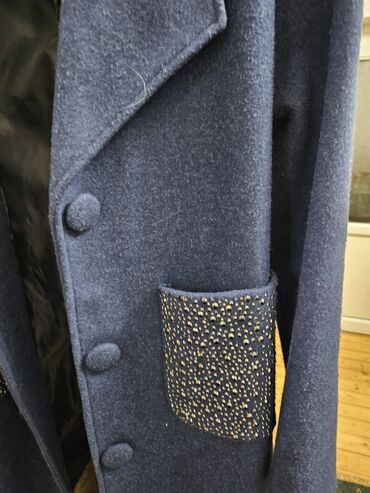 Elemа qadın palto - Model: qısa uzunluqlu, ikiqat düyməli (double-breasted) dizayn - Rəng və naxış: tünd lacivərt əsas üzərində xırda ağ “mələkotu” tipli tekstural naxış - Material: qalın, toxumal...