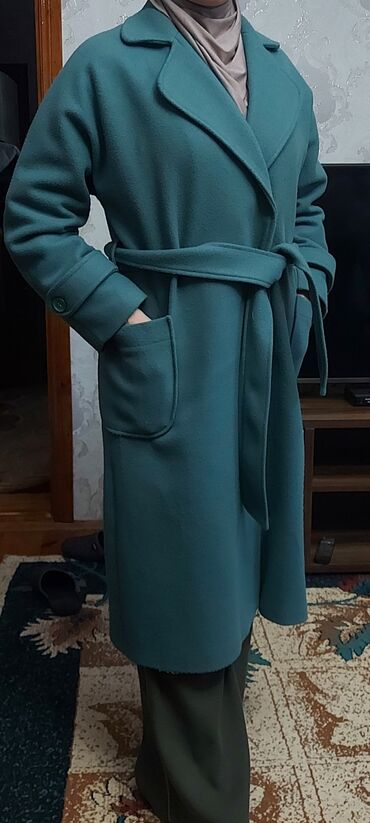 Razmer L. Türkis rəngli qadın palto - Model: qalın, isti və yumşaq toxumalı, düz kəsim - Bağlanma: kəmərli, ətə qədər uzanan ön bağlama - Yaxa: geniş klassik dönən yaxa - Ciblər: ön hissədə iki bö...