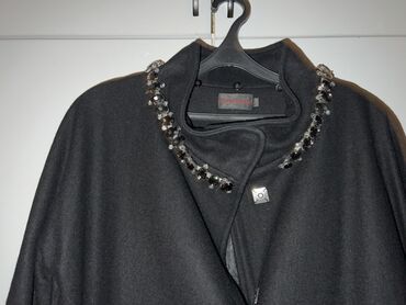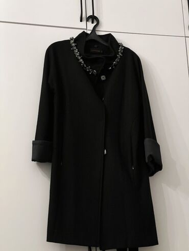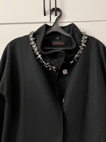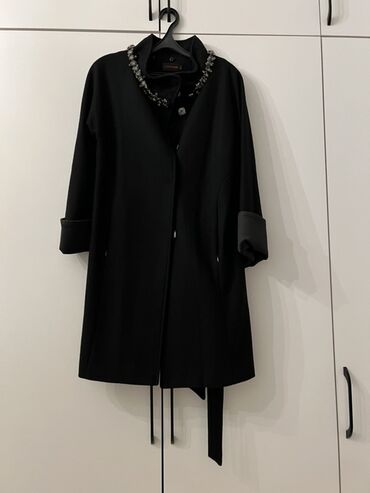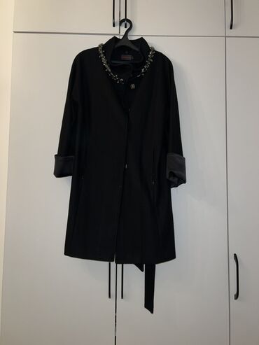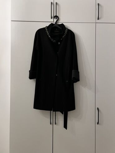 Qadın paltosu – FLENIVIARÉ, ölçü M - Rəng: qara - Dizayn: dizdən yuxarı uzunluq, düz siluet - Yaxa: bəzək daşları ilə işlənmiş stend yaxa (çıxıntılı dekor) - Bağlanma: gizli düymə/snap düymə - Qol...