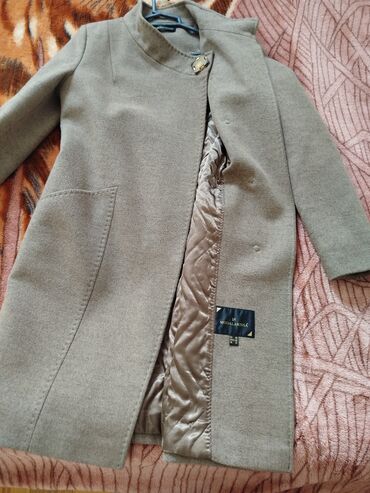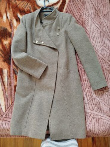 Qadın palto – MODALARISSA - Rəng: boz-bej ton - Model: asimmetrik ön qapama, gizli basma düymələr; çiyində dekorativ metal toka detallı stend yaxa - Uzunluq: dizə yaxın (klassik düz kəsim) - Mater...