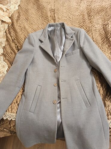 Razmer:48 - Rəng: boz tonlarda incə şaquli zolaqlar - Boyu: təxminən dizdən bir qədər aşağı - Yaxa: geniş, drapeli/şarf tipli yaxa, üst hissədə tək düymə ilə bağlanır - Qol: 3/4 uzunluqda, genişlən...