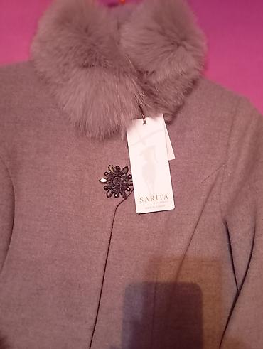 Qadın palto – boz rəng - Model: dizə qədər uzunluq, düz kəsim - Material: qalın yun qarışımlı parça, iç hissəsi qızılı rəngli, diaqonal tikili isti astarlı - Yaxa: yumşaq tüklü/saçaqlı yaxa (eyni b...