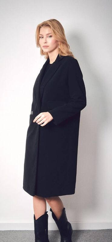 Qadınlar üçün klassik qara palto - Rəng: dərin qara - Kəsim: uzun, düz siluet; yumşaq çiyin xətti - Yaxa: geniş, qatlanan (notched lapel) - Bağlanma: gizli düymə/ilək üçün kəsik (ön hissədə) - Cib...