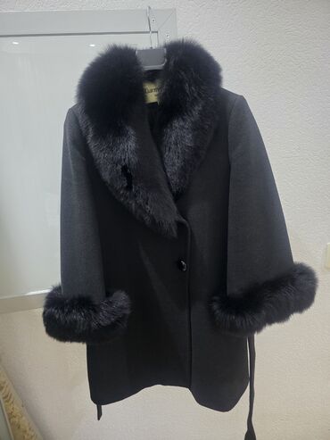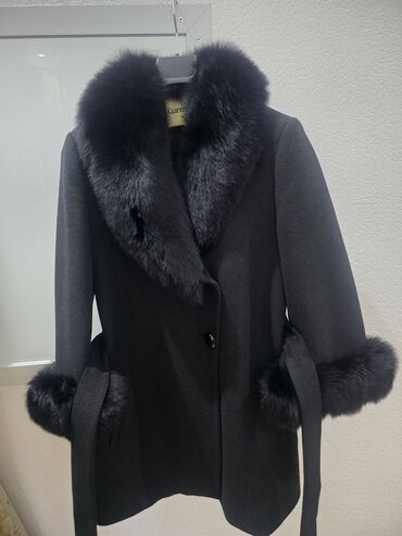 Qadın palto - Rəng: tünd boz (xırda şevron/qaşınma fakturalı parça) - Material: qalın, isti toxuma parça - Yaxa: iri, həcmli tünd tüklü yaxa (çıxarıla bilən ola bilər – iynə/sancaqlı bərkidici gör...
