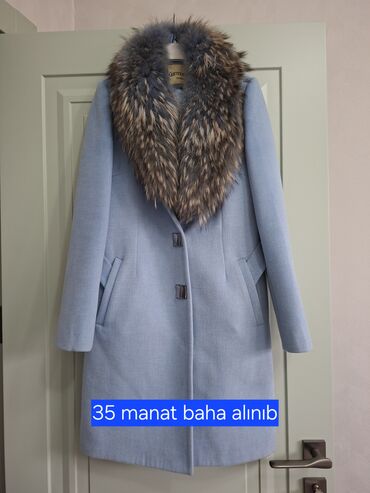 Ölçü. 46 Qadın palto – tünd göy rəng - Klassik düz kəsim, dizdən bir qədər uzun - Yumşaq, isti parça; qalın foder - Yaxasında və qol uclarında eyni rəngdə süni kürk detalları - Ön hissədə iri, de...