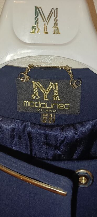 Məhsul: Uzun qadın palto Brend: Milhan (etiket üzərində) Rəng: Tünd göy əsas, yan panellərdə mavi-yaşıl naxışlı parça Model: Standart yaxa, ikicərgəli dekorativ düymələr, uzunqol, döşəməyə yaxın uz...