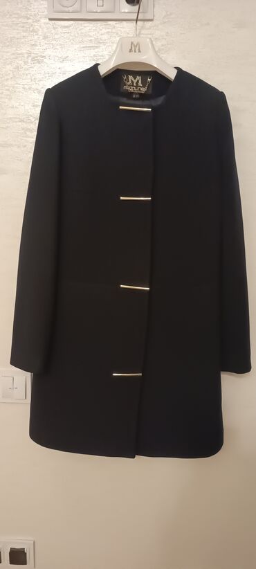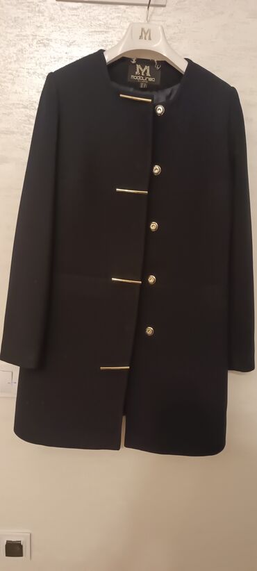 Qadın paltosu – FLENIVIARÉ, ölçü M - Rəng: qara - Dizayn: dizdən yuxarı uzunluq, düz siluet - Yaxa: bəzək daşları ilə işlənmiş stend yaxa (çıxıntılı dekor) - Bağlanma: gizli düymə/snap düymə - Qol...