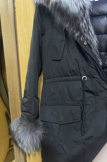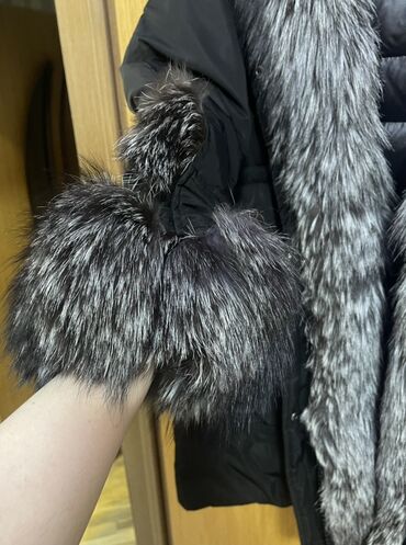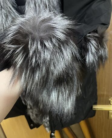 - Ön hissə, qapaqlı kapüşon və qol ucları boyunca sıx, gümüşü-boz tonda qalın tük (saçaqlı xəz effektli) bəzək