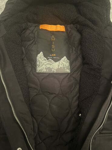 Qadın qış kurtkası – qara, kapüşonlu, süni kürk haşiyəli. - Brendlər: MS Mode (etiketdə 42 ölçü), Lolaliza – Belgian Design, Outerwear Collection (etiketdə 44 ölçü). - Uzun model, bel hissəsi yün...