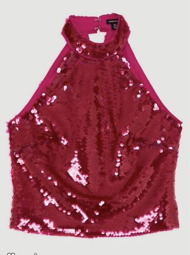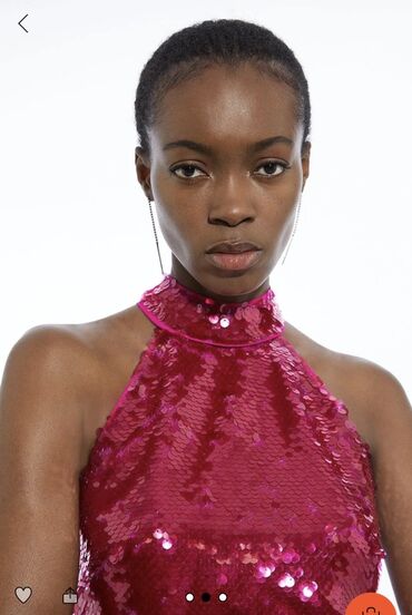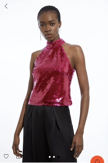 Qadın bluzası – elektrik-mavi rəngdə, qısaqol, yumru yaxalı. Ön hissədə drapeli (qatlı) dizaynla açıq dekolte effekti yaradılıb və altında parlaq mavi-payetli panel yerləşir; payetlər gradient keçi...