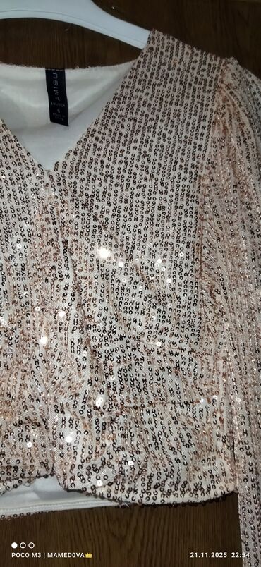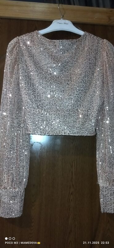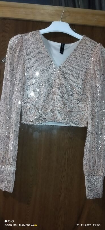 Parlaq payetkalarla bəzədilmiş qadın bluz/krop-top ölçüsü S razmerdir