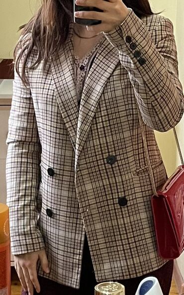 Qadın üçün klassik qara-qəhvəyi xallı/çəhrayı tonlu dama naxışlı blezer. - Üslub: İkiqat düyməli (double-breasted) - Rəng və naxış: Bej-qəhvəyi əsas, xırda qırmızı xəttlərli dama (plaid) - Materia...