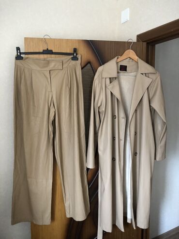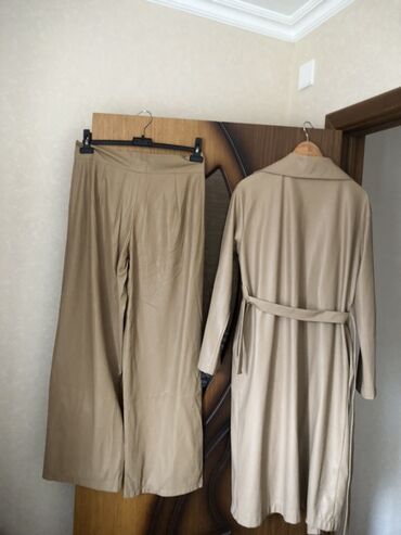 Sadə və zərif görünüş üçün uyğun, ofis və gündəlik kombinlərdə asanlıqla istifadə oluna bilən, neytral bej ton. Material vizual olaraq hamar və yüngül parıltılıdır (süni dəri/deri effektli görünüş). Dəst uyumlu şəkildə birlikdə və ya ayrı-ayrılıqda geyinə bilər.