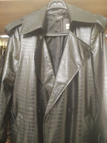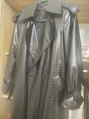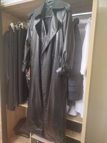 EndirimsizCHEEYA uzun trençkot – qara, krokodil teksturalı parıltılı eko‑dəri. Klassik ikiqat düymələmə, geniş haşiyəli yaxalıq və epoletlər. Qollar kəmərli büzməli dizaynla tənzimlənir. Yanlarda dərin kəsik ciblər, arxada rahat hərəkət üçün aşağı hissədə şaquli yarıq. Düz siluet, dizdən aşağı uzunluq, tam astarlı. Şəhər stili və axşam kombinləri üçün nəzərdə tutulmuş elegant üst geyimi. Brend etiketləri üzərindədir.