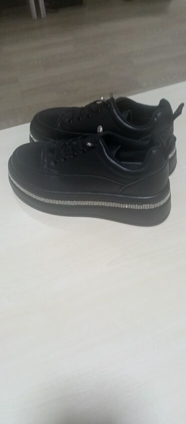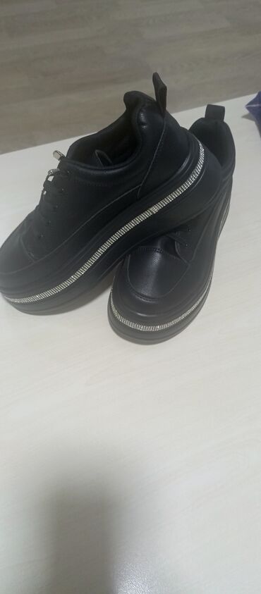 Qadın platforma krossovkaları - Rəng: qara - Material: parlaq dərimsi üst hissə, yumşaq içlik - Bağlama: krujeva (parıldayan dekorativ saplarla) - Platforma: qalın, tam platformalı altlıq - Dizayn...