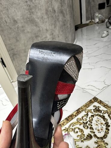 Məhsul: Qadın platforma sandal - Rəng: Qara üst hissə, qızılı platforma və qızılı hündur daban - Üst material: Parıltılı toxumalı zolaqlar (çarpaz dizayn), laklı qara platforma üzlüyü - Daban: Təx...