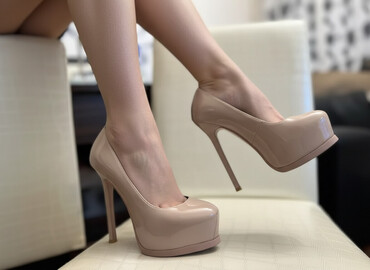 Qadın üçün klassik tufli (stiletto) - Rəng: açıq bej/nude - Model: klassik sivri burun, qapalı ayaqqabı - Dabandan hündürlük: təxminən 9–10 sm incə daban - Material: hamar, parlaq səthli süni dəri...