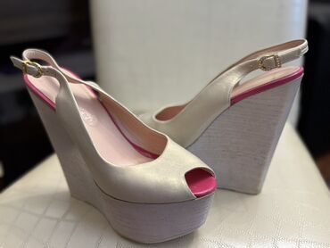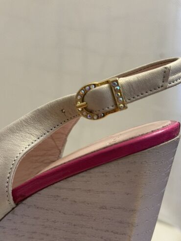 Yüksək platforması sayəsində boyu uzaldır, açıq burun və tənzimlənən qayış isə rahatlıq və sabitlik verir. Parlaq çəhrayı kontrast və daşlı toka ayaqqabıya diqqətçəkən və zərif görünüş qatır.