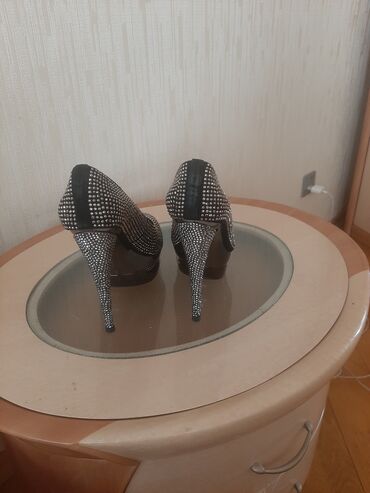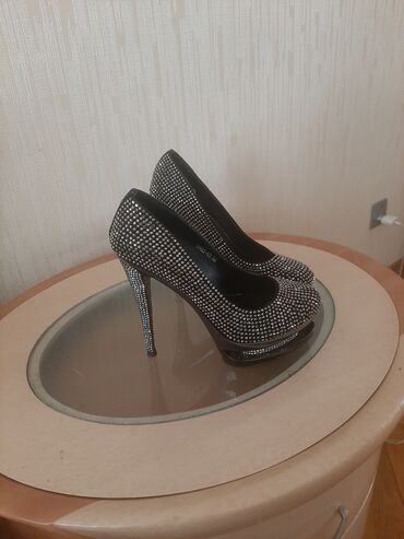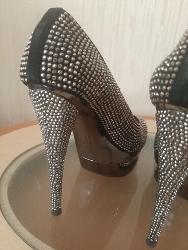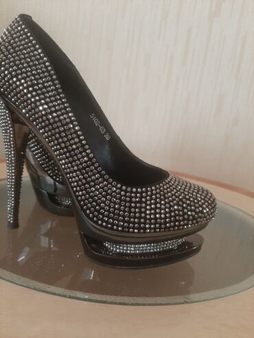 - Rəng/naqram: Qara baza üzərində sıx düzülmüş gümüş tonlu rhinestone bəzəklər; daban və platforma hissəsi də daşlıdır.