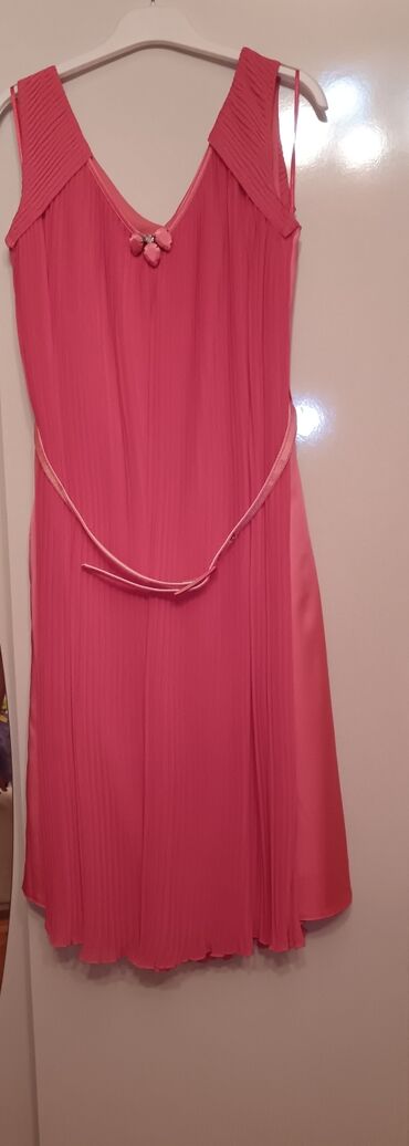 Zərif qadın paltarı – açıq çəhrayı rəngdə, dizdən aşağı uzunluq. - Qolsuz, qapalı yuvarlaq boyun kəsimi - Bədəni vurğulayan, bel hissəsində yığma tikiş detalları - Yanlardan düşən plise/qat effe...