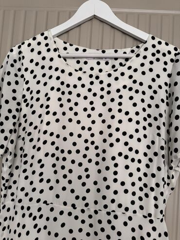 Ağ rəngli, qara xallı qadın paltarı. Klassik polka-dot naxışı ilə dizdən aşağı uzunluqda, yüngül və axıcı kəsim. Üst hissə yığcam, ətək isə geniş açılan siluetdədir. Qalın, iri dekorativ ağ yaxalıq...