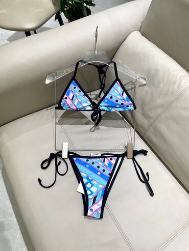 Məhsul təsviri: - Qadın geyim dəstləri və bikini toplaması. - Şəkillərdə: 1) Qara bikini: büstqalter üstü (bağlama ipləri ilə), üçbucaq formalı alt hissə. Üzərinə geyinmək üçün tropik yarpaq pri...