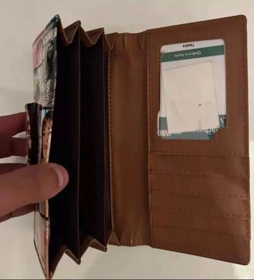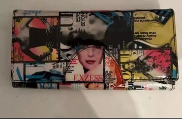 - Rəngarəng çaplı pulqabı: Pop-art/jurnal üslubunda çoxrəngli naxışlar, düyməli-qatlanan dizayn. Kart bölmələri və kağız pul üçün hissələrə uyğun klassik ölçü.