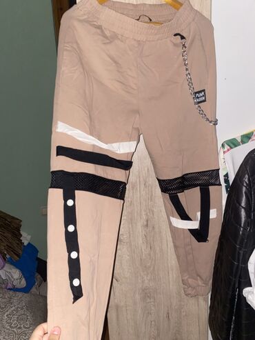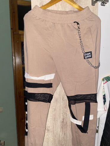 - Şalvar: elastik bel, yanlarda cib, çıxarıla bilən metal zəncir aksesuarı, diz hizasında tor parçalar, qara-ağ dekorativ zolaqlar və lent detallar