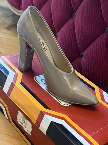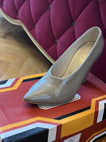 - Məhsul: Qadın klassik tuflisi - Rəng: Bej/nude - Material: Parlaq laklı üst, iç hissə yumşaq astarlı - Burun forması: Ucu sivri (pointed toe) - Daban: Nazik, təxminən 5–6 sm orta hündürlük - Bağl...