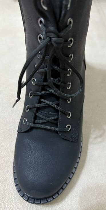1 defe geymisem. Ağ rəngli qadın botları - Model: qalın dişli platformalı, bağcıqlı - Material: dəri görünümlü üst, iç hissə tünd astarlı - Dizayn: topuğa qədər hündürlük, yuxarı hissədə tənzimlən...