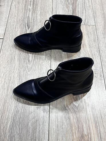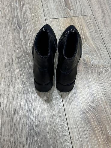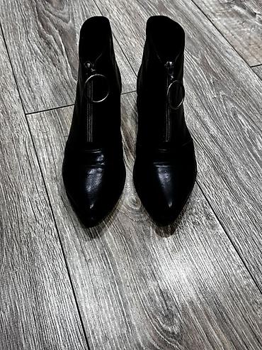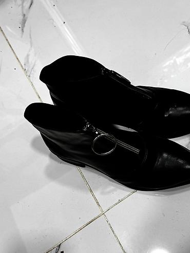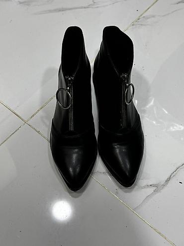 Qadın botları – qara rəng.Razılaşma yolu ilə satılır.1dəfə geyinilib.Səhv razmer seçiminə görə satılır - Model: qısa boğazlı, klassik sivri burun - Material: hamar, parlaq üst material (eko‑dəri g...