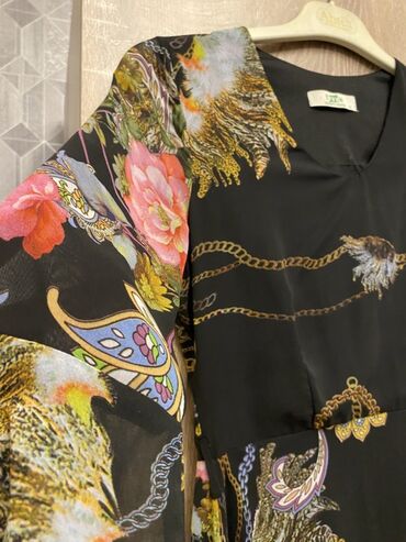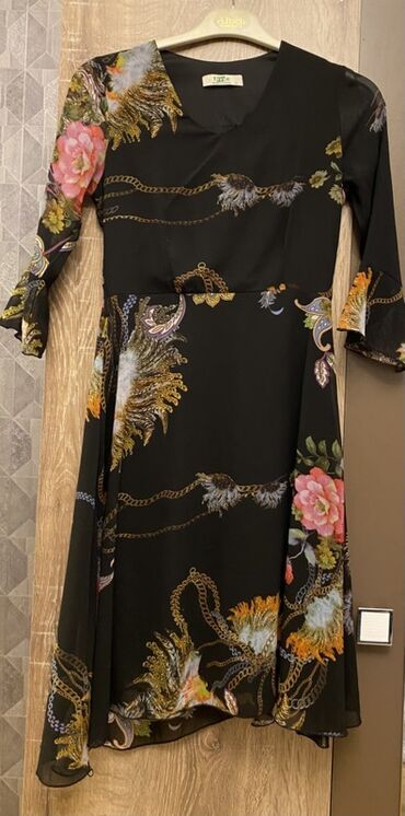 Qadın paltarı – qara rəngli, rəngarəng çiçək və zəncir printli dizayn.