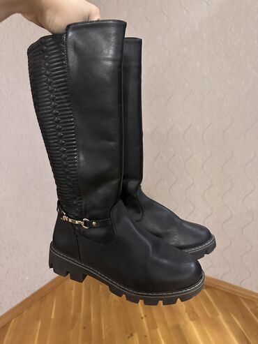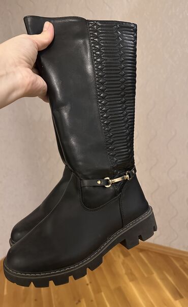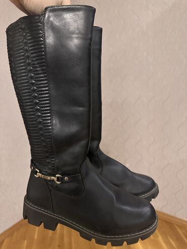 Qadın üçün dizə yaxın uzunluqda qara payız/qış çəkmələri.