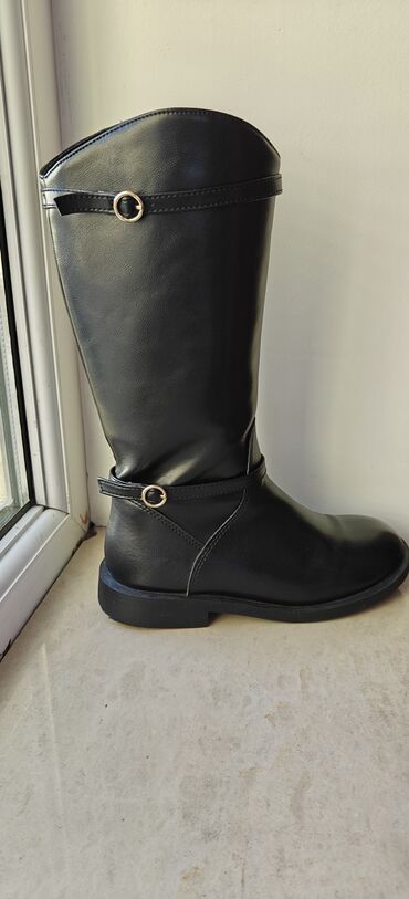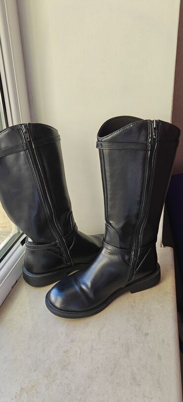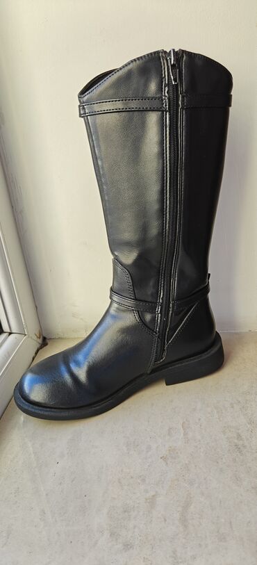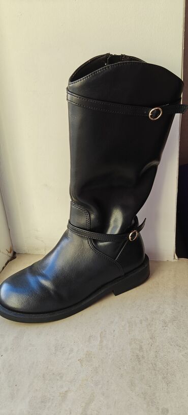 Qara rəngli uşaq/qərmə boyu botlar 33 razmer - Material: süni dəri üstlük, iç hissə tekstil - Rəng: mat qara - Dizayn: yan hissədə praktik fermuar, üst hissədə elastik panel; kəmər və metal asqı d...