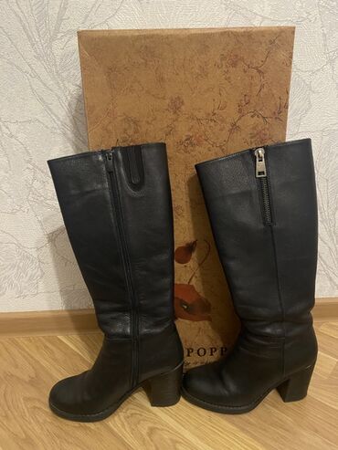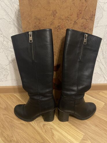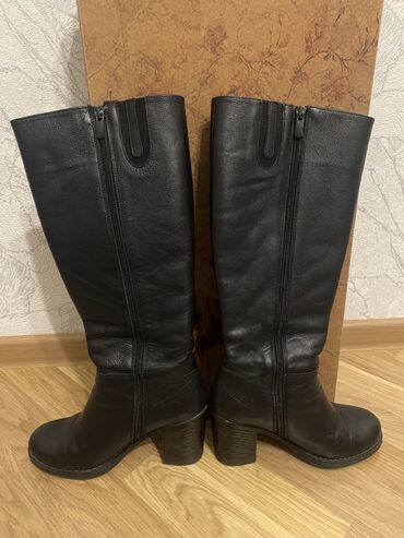 Qadınlar üçün qara uzunboğaz çəkmə - Material: hamar qara dəri effekti - Dizayn: dizə yaxın yüksək boğaz, yan tərəfdə tam uzunluqlu fermuar və metal asqılı dartma - Burun forması: yuvarlaq - Daban...