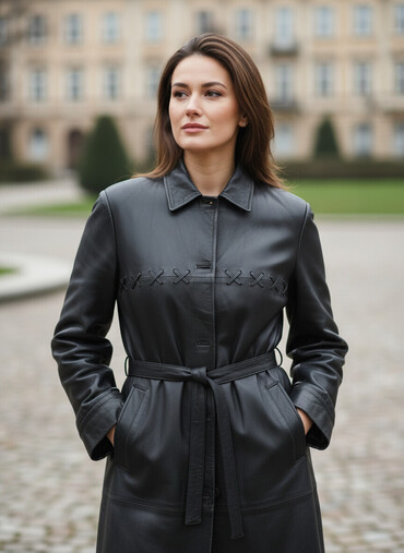 İşlənmişDəri materialdan hazırlanmış qara rəngli qadın plaşı. Öndən düymələrlə bağlanır və bel hissəsində kəməri var. Dizaynda bəzəkli tikiş detalları mövcuddur. İstər gündəlik istifadə, istərsə də xüsusi tədbirlər üçün uyğundur.