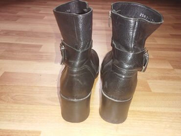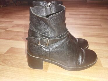 Qadınlar üçün qara dəridən qısa çəkmə - Material: hamar qara dəri (parlaq səth) - Model: topuğa qədər, yan hissədə ikili qayış və metal toka detalı - Daxili: isti astar (şaxta üçün uyğun), yan tər...