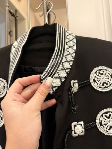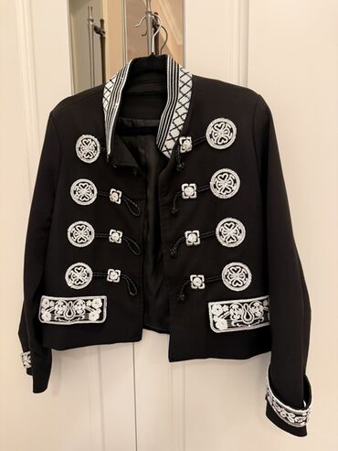 Qısa qara jaket 1defe geyinilib - Model: qısa kəsimli, önü iki düyməli - Rəng: klassik qara - Yaxa və çiyin hissəsi: toxumalı/mesh fakturalı panel, dairəvi yaxa - Qol: geniş, qısa qollar - Parça:...