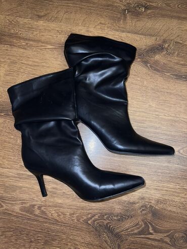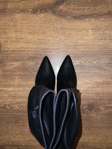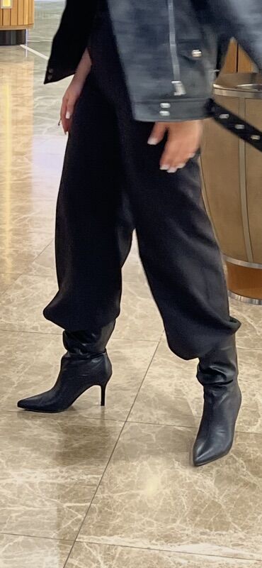 Qadın dizə qədər qara çəkmə - Model: iti burunlu, kəsik dabanlı (qalın, stabil kvadrat formalı yüksək daban) - Rəng: qara - Material: hamar dəri görünüşlü üstlük - Detallar: bilək hissəsində dekor...