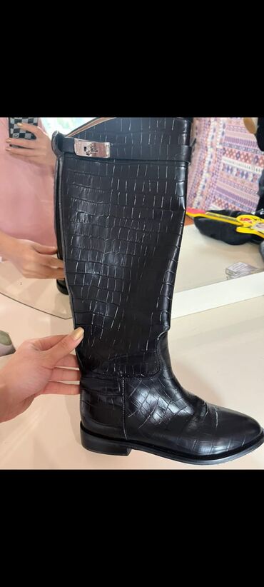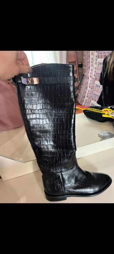 Qadın uzun temiz dəri çəkmə baha alınıb - Rəng: tünd qəhvəyi - Material: yumşaq dəridən, dekorativ iri tikişlər - Dizayn: dizə yaxın hündürlük, yan tərəfdə metal tokalı dekorativ kəmər - Daban: qa...