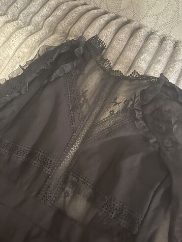 - Üst hissə: şəffaf krujeva panel, V formalı krujeva işləmələr, incə büzməli (ruffle) bəzəklər və uzun krujevalı qollar.