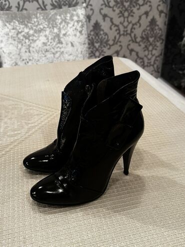 Qadın üçün qara qısa çəkmə (ankle boot): - Material: hamar süni/deri görünüşlü üstlük, içi yumşaq tekstil astarlı - Burun: kəskin/uc burun - Daban: nazik stilettо tipli, təxminən 7–8 sm - Bağlanma:...