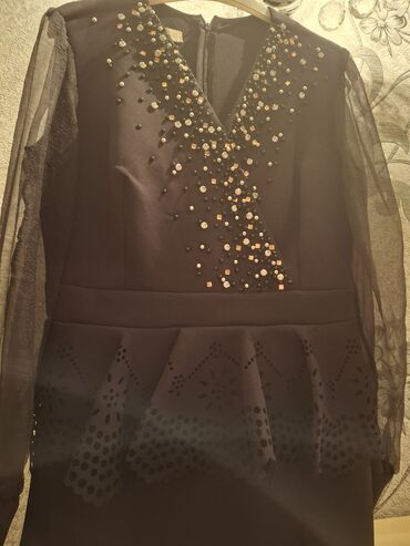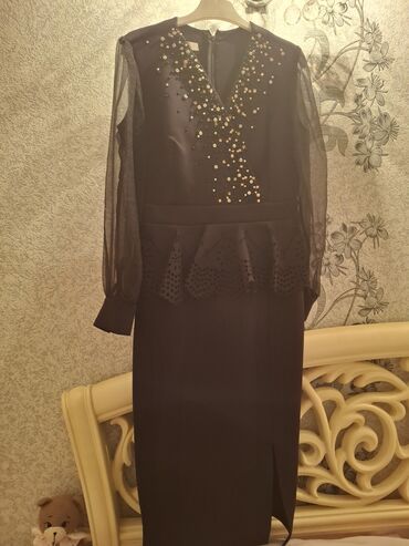 Ziyafət donu – 30 AZN - Rəng: qara - Stil: bədənə oturan, midi uzunluq - Yaxa: balıqçı tipli qapalı yaxa - Qol: qısa qol - Çiyin detalları: asma daş/sancaq bəzəkləri - Etek hissə: asimmetrik kəsim...