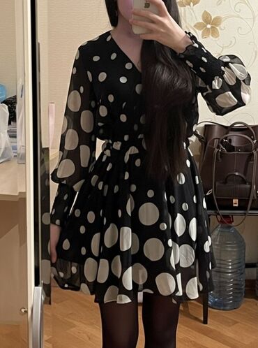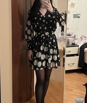 M- L razmer. Qara rəngli, ağ xallı qadın donu - Model: mini uzunluq, yuxarıdan aşağıya xallı naxış - Yaxa: qapalı/boğazı yüngül büzgülü - Qol: uzun qol, manjet hissəsi büzgülü - Bel: yığma/rezinli...