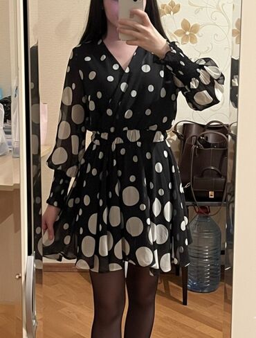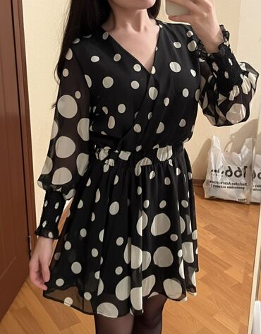 Mango ,S Qara rəngli, ağ xallı qadın donu - Model: uzun qollu, A-kəsim, aşağı hissədə yığmalı/qatlı ətək - Yaxa: V formalı - Parça: nazik, axıcı toxuma; üzərində teksturalı ağ xal (relief effektli...